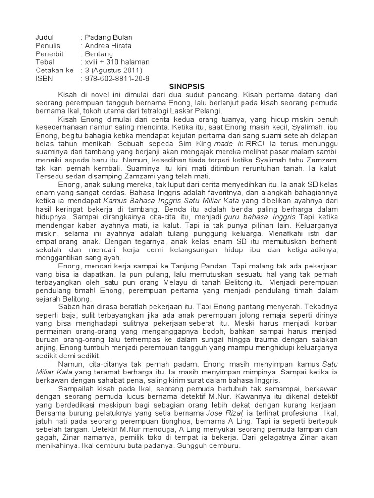 The form of the image of women to be studied in this study is the self-image of. Ini formatnya PDF jadi silahkan dibuka pake Adobe Reader. Novel Padang Bulan karya Andrea Hirata adalah sebagai berikut.