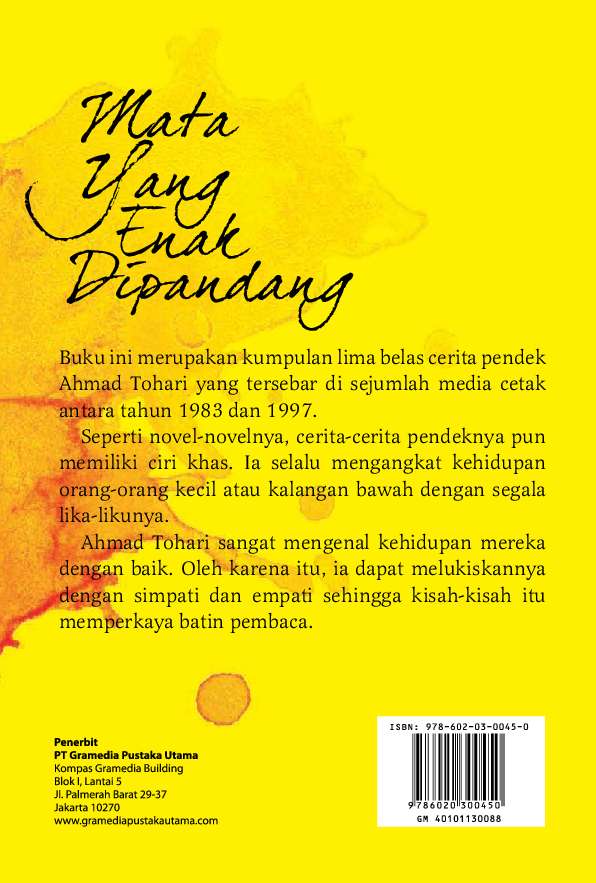 135 x 20 cm. Buku cerita pendek Mata yang Enak Dipandang merupakan kumpulan lima belas cerita pendek Ahmad Tohari yang tersebar di berbagai media cetak di Indonesia antara tahun 1983 dan 1997.